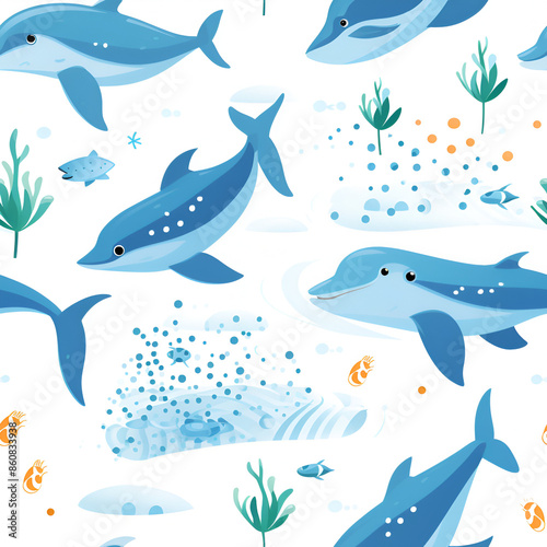 © adam, Fototapeta premium Cute Seamless Pattern with Dolphins and Sea Waves