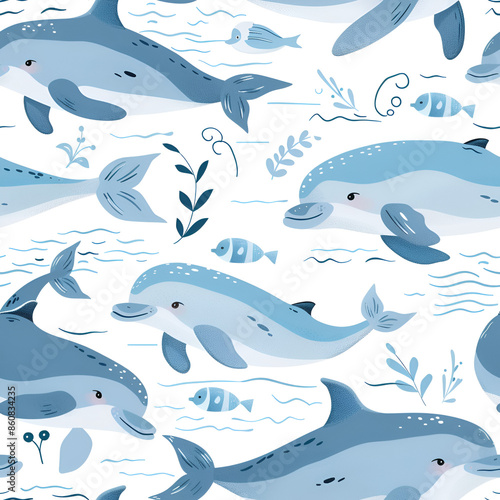 © adam, Naklejka premium Cute Seamless Pattern with Dolphins and Sea Waves