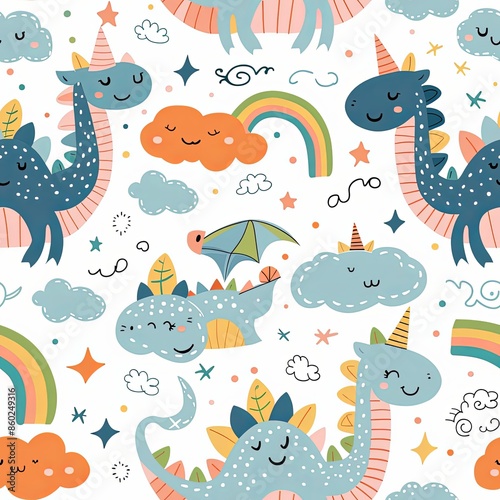 Obraz premium Cute Seamless Pattern with Dragon and Rainbow