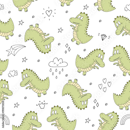 Obraz premium Cute seamless pattern with funny dinosaurs. vector illustration.