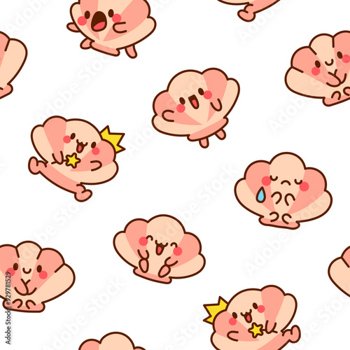 Obraz premium Cute seashell with smiling face. Seamless pattern. Kawaii cartoon character....