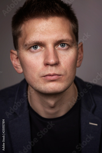 © Анна Демидова, Fototapeta premium Cute serious young man in a jacket, close-up, gray background