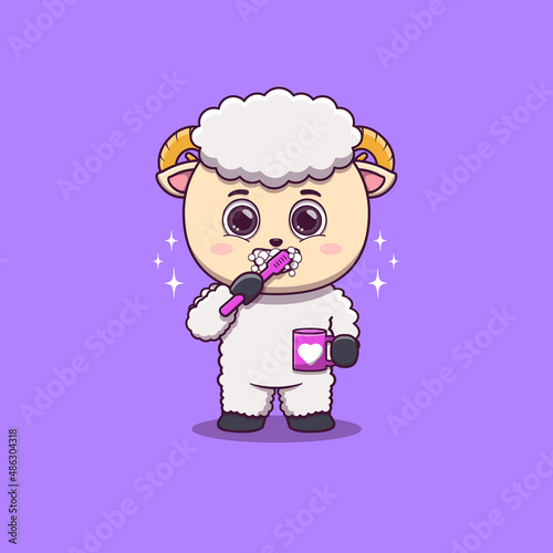 © noriweuhcs, Obraz premium Cute Sheep brushing teeth while holding mug