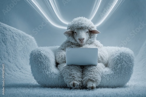Obraz premium Cute sheep delighted by technology in bright morning room. Morning sheep. Why...