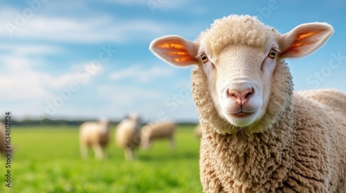 © khonkangrua, Obraz premium Cute Sheep in Green Pasture with Blue Sky and White Clouds in Background