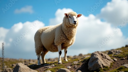 © AkuAku, Fototapeta premium Cute sheep standing on green grass in Cusco, Peru