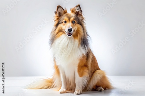 Fototapeta premium Cute Sheltie Dog Sitting Comfortably on White Background for Urban...