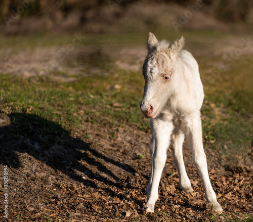 Fototapeta premium Cute shetland pony. Clumsy foal of a small horse.