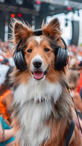 Fototapeta premium Cute Shetland Sheepdog dog with headphones on music festival crowd concert...