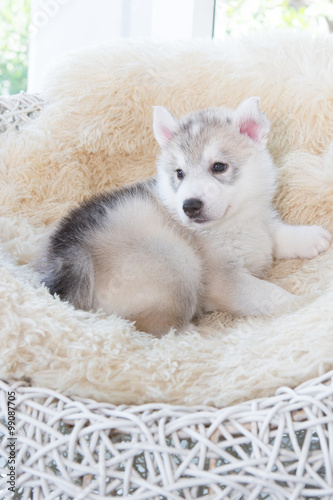 Fototapeta premium cute siberian husky puppy sleep on rattan chair