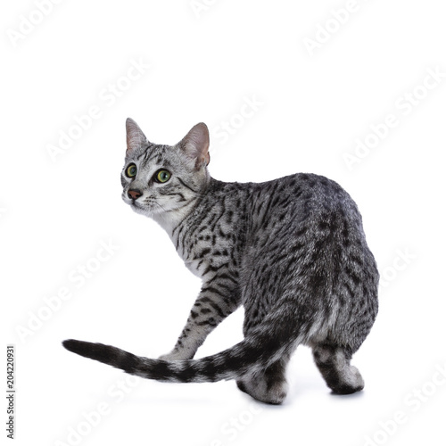 © Nynke, Fototapeta premium Cute silver spotted Egyptian Mau cat kitten walking / turning around isolated on white background and looking over shoulder