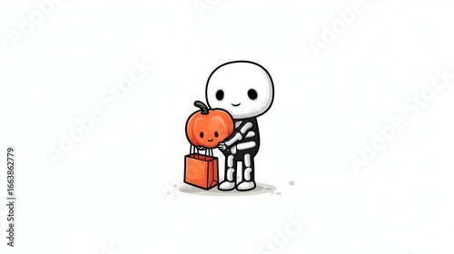 © Josiah, Obraz premium Cute skeleton character enjoying Halloween while hugging a smiling pumpkin in a festive atmosphere