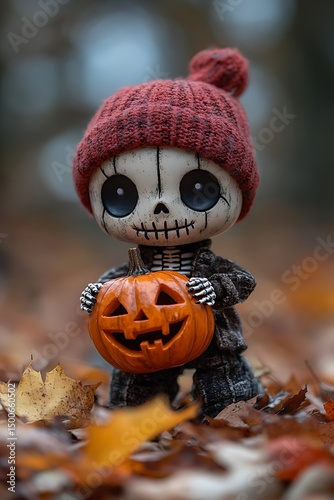 © Marifatul, Naklejka premium Cute skeleton holding pumpkin in autumn leaves