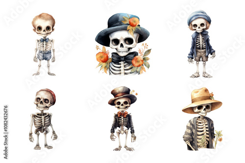 © KidsStation, Fototapeta premium Cute Skeleton Watercolor Collection Bundle Set Isolated on a Transparent Background