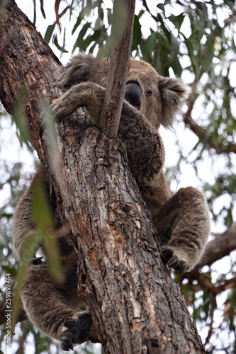 Fototapeta premium Cute sleepy Koala sitting on a tree and hugging it