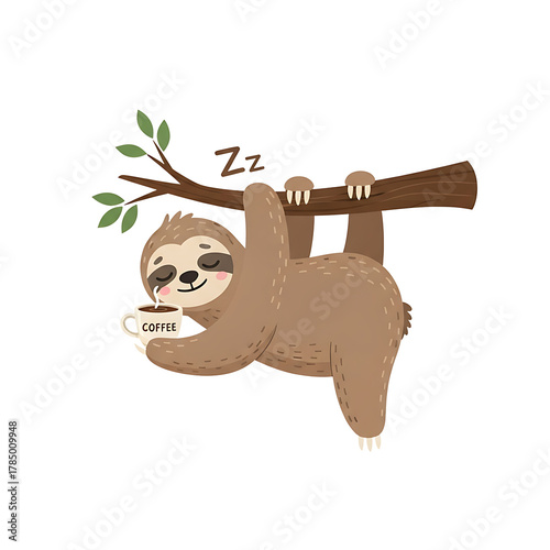 Naklejka premium Cute sleepy sloth hanging from a tree branch holding a coffee cup isolated on...