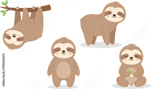 © MdMunzurul, Naklejka premium Cute Sloth Cartoon Collection Flat Vector Illustration Set Isolated on White Background