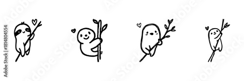 Obraz premium Cute Sloth Characters On Branches Line Icon Set In Doodle Style. Adorable...