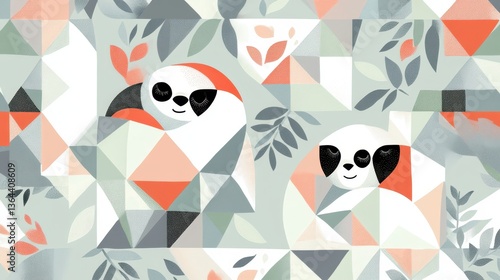 © background, Obraz premium Cute Sloth Geometric Pattern with Tropical Leaves.