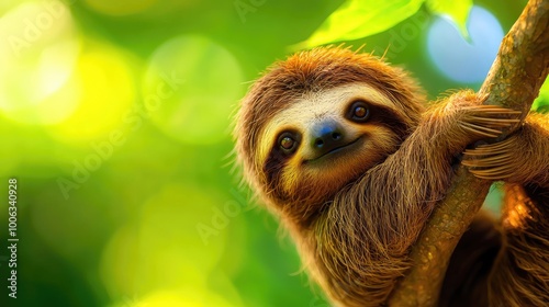 © Vodkaz, Fototapeta premium Cute sloth hanging on a tree branch in a lush green environment.