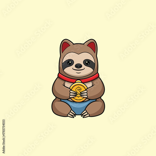 © salfuddin, Obraz premium Cute sloth holding a gold coin, representing wealth and prosperity.