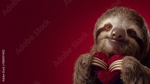 Fototapeta premium Cute sloth holding a red heart-shaped cushion against a deep red background, showcasing a playful and endearing expression with a soft fur texture