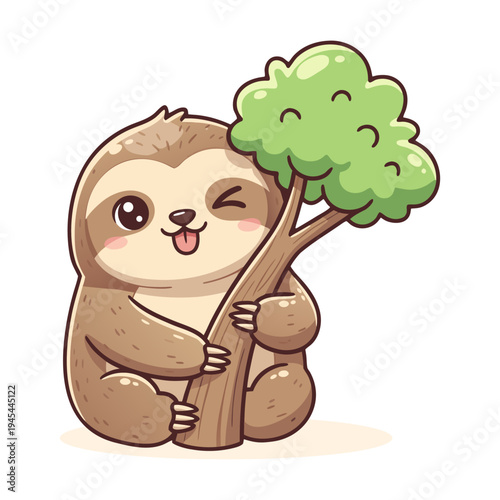 Fototapeta premium Cute Sloth Hugging a Tree Illustration in Isolated White Background