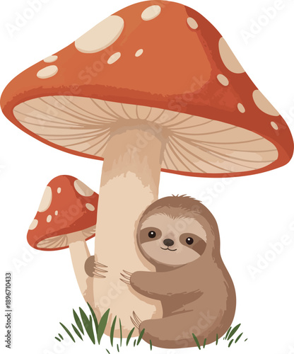Fototapeta premium Cute Sloth Hugging Giant Mushroom Woodland Creature Vector Illustration