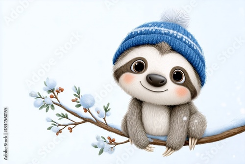 © Mikhail, Fototapeta premium Cute sloth in blue winter hat sitting on snowy branch. Animal character design for greeting card or winter holiday illustration.