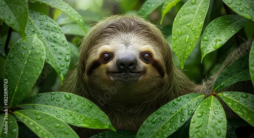 © Sugiri80, Naklejka premium Cute Sloth Peeking Through Wet Green Leaves