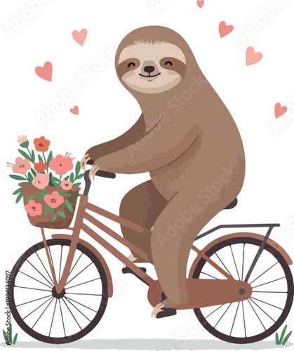 Naklejka premium Cute Sloth Riding Bicycle With Flowers Vector Illustration Pastel Colors