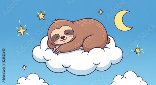 Naklejka premium Cute sloth sleeping on a cloud with stars and moon