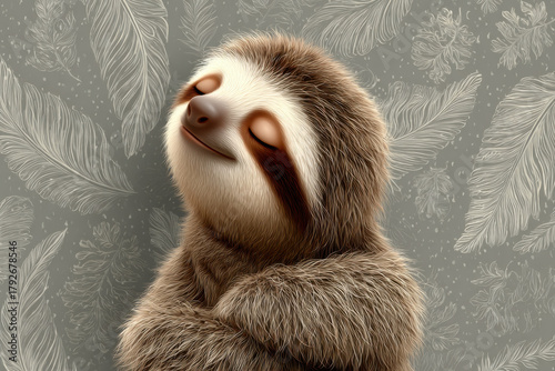 © Siriroj, Obraz premium Cute Sloth Smiling with Eyes Closed on Feather Pattern Background, Happy Animal Illustration for Relaxation, Peace, and Tranquility Concepts