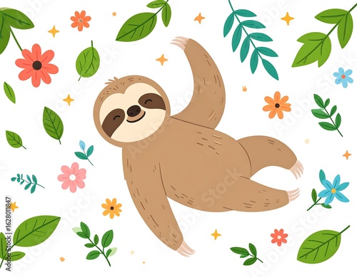 © Zebra, Naklejka premium Cute sloth surrounded by flowers and leaves (2)