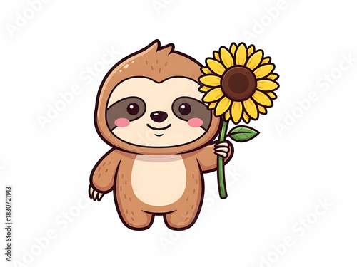 © PixelMuse, Naklejka premium Cute Sloth Vector Illustration, Holding Sunflower and Adorable Cartoon Character