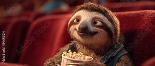 © Dar1930, Fototapeta premium Cute Sloth Watching Movie with Popcorn – Generative AI
