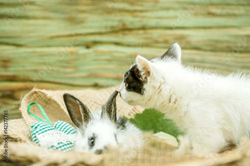 Fototapeta premium Cute small rabbit and little cat playing on sackcloth