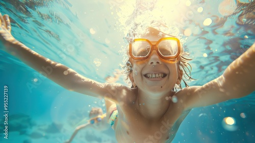 Fototapeta premium Cute smiling child having fun swimming and diving in the pool at the resort on summer vacation. Sun shines under water and sparkling water reflection. Activities and sports to happy kid