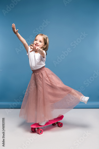 Naklejka premium Cute smiling girl in pink skirt standing on skateboard and having fun