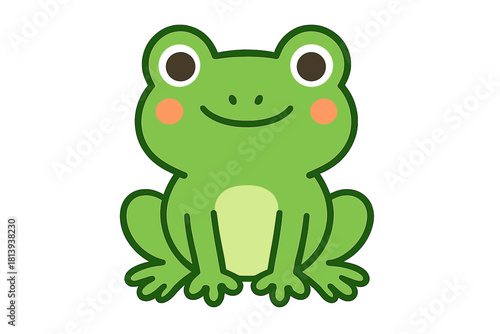 © icon_art, Fototapeta premium Cute smiling green frog character sitting facing forward on a plain white background