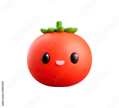 © practice , Obraz premium Cute smiling kawaii tomato with green leaves in 3d style on transparent background, PNG