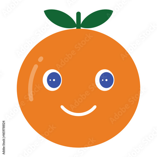 © Shahinur Design, Fototapeta premium Cute smiling orange cartoon vector with blue eyes, green leaf, and glossy highlight. Perfect for kids’ designs, stickers, logos, healthy food branding, packaging, and fun educational projects.