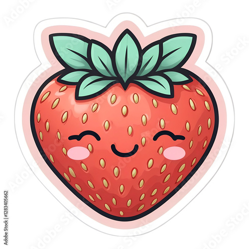 Obraz premium Cute Smiling Strawberry Cartoon Sticker Kawaii Fruit Food Illustration Art