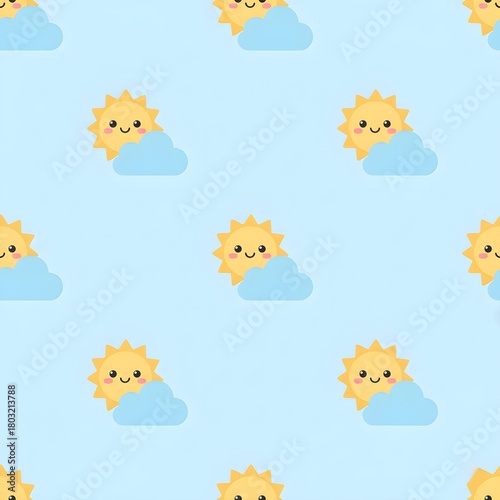 © Armansyah, Obraz premium Cute Smiling Suns and Clouds Seamless Pattern