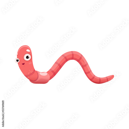 Fototapeta premium Cute smiling worm cartoon character, funny crawling earthworm personage. Isolated vector squirm grub, garden insect. Earth or soil garden earthworm. , isolated orchard invertebrate smiling creature