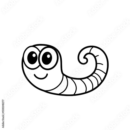 © Nur vector , Naklejka premium Cute smiling worm with curled body and expressive eyes in black outline cartoon design for children’s content