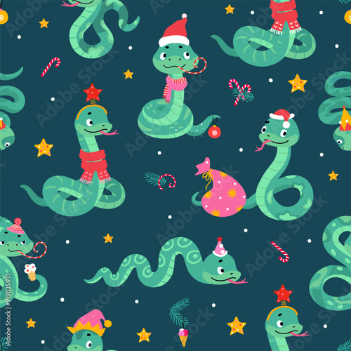 Obraz premium Cute snakes seamless pattern. Christmas new year snake, winter holiday printable template for fabric wrapping posters. Cartoon nowaday vector background