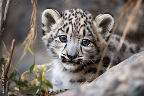 © Katynn, Fototapeta premium Cute snow leopard cub. Snow leopard baby portrait. digital ai art