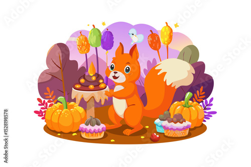 © Mihir, Obraz premium Cute squirrel celebrating birthday with autumn treats
