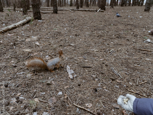 Obraz premium Cute squirrel is fed with hands in a pine forest